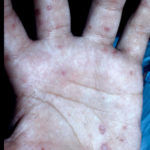 Erupção cutânea: manchas vermelhas ou bolhas nas palmas das mãos, plantas dos pés e, às vezes, nas nádegas.