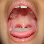 Há breve pródromo de 12-36 horas de duração que consiste de: febre baixa, com uma temperatura média de 38,3 ° C e duração de 2-3 dias, anorexia, mal-estar, dor abdominal, dor na boca e tosse. Em um estudo, 80% das crianças apresentaram-se com anorexia e dor na boca. As lesões bucais se iniciam como máculas eritematosas que evoluem para vesículas com 2-3 mm de base eritematosa. As vesículas são raramente observadas, porque rapidamente ulceram. São dolorosas e podem interferir com a alimentação. O número médio total de úlceras é de 5-10. As vesículas podem envolver o palato, mucosa bucal, gengiva e língua. A língua está envolvida em 44% dos casos, e, além de úlceras, a língua pode ser edematosa e macia.