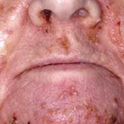 o Iniciam como manchas vermelhas que evoluem para placas com bolhas que podem ser vistas no centro das lesões que, posteriormente, dessecam e tornam-se crostas e levam a erosões. Geralmente se apresenta como uma erupção anular irregular com uma borda de avanço serpiginosa.